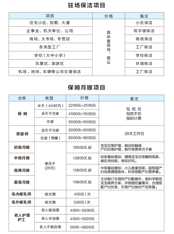 孔雀河家政服務(wù)參考價(jià)格表